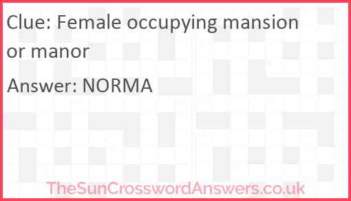 Female occupying mansion or manor is a crossword clue for which we have 1 possible answer and we have spotted 2 times in our database. This crossword clue was last seen on 07 November 2024 in The Sun Cryptic Crossword puzzle!