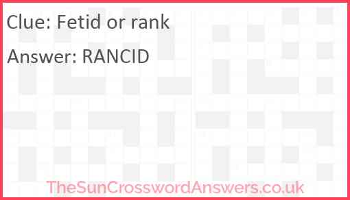 Fetid or rank is a crossword clue for which we have 1 possible answer and we have spotted 6 times in our database. This crossword clue was last seen on 18 February 2024 in The Sun Coffee Time Crossword puzzle!