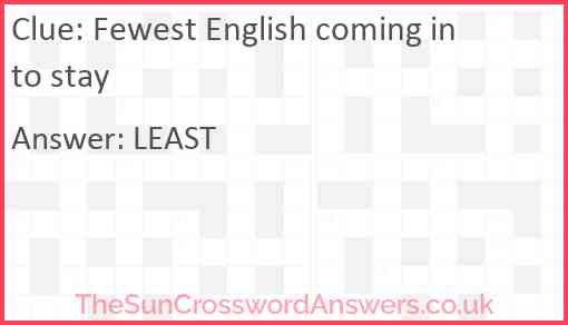 Fewest English coming in to stay is a crossword clue for which we have 1 possible answer and we have spotted 2 times in our database. This crossword clue was last seen on 22 October 2023 in The Sun Cryptic Crossword puzzle!