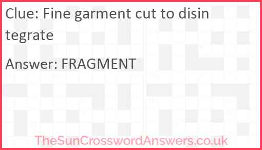 Fine garment cut to disintegrate is a crossword clue for which we have 1 possible answer and we have spotted 2 times in our database. This crossword clue was last seen on 09 May 2021 in The Sun Cryptic Crossword puzzle!