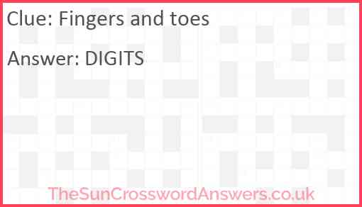 Fingers and toes is a crossword clue for which we have 1 possible answer and we have spotted 2 times in our database. This crossword clue was last seen on 15 May 2023 in The Sun Coffee Time Crossword puzzle!