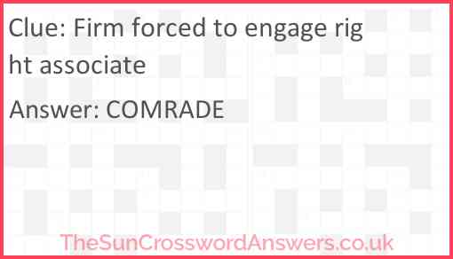 Firm forced to engage right associate is a crossword clue for which we have 1 possible answer and we have spotted 3 times in our database. This crossword clue was last seen on 09 June 2024 in The Sun Cryptic Crossword puzzle!