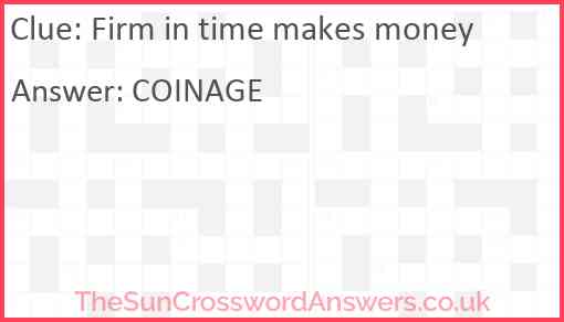 Firm in time makes money is a crossword clue for which we have 1 possible answer and we have spotted 5 times in our database. This crossword clue was last seen on 03 August 2025 in The Sun Cryptic Crossword puzzle!