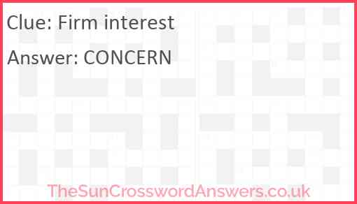 Firm interest is a crossword clue for which we have 1 possible answer and we have spotted 3 times in our database. This crossword clue was last seen on 17 June 2024 in The Sun Cryptic Crossword puzzle!
