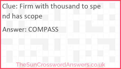 Firm with thousand to spend has scope is a crossword clue for which we have 1 possible answer and we have spotted 2 times in our database. This crossword clue was last seen on 12 August 2024 in The Sun Cryptic Crossword puzzle!