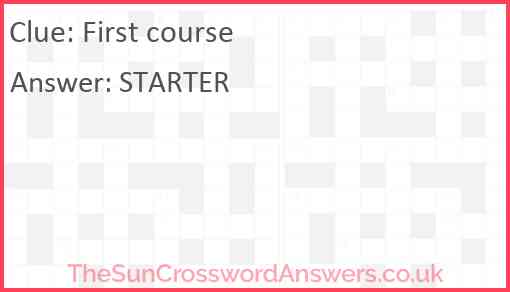 First course is a crossword clue for which we have 1 possible answer and we have spotted 3 times in our database. This crossword clue was last seen on 13 February 2024 in The Sun Coffee Time Crossword puzzle!