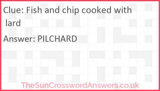 Fish and chip cooked with lard is a crossword clue for which we have 1 possible answer and we have spotted 1 times in our database. This crossword clue was last seen on 31 May 2020 in The Sun Cryptic Crossword puzzle!