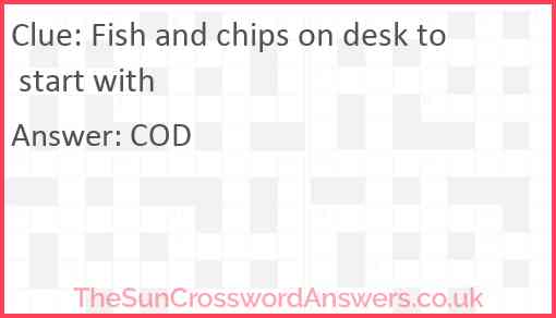Fish and chips on desk to start with is a crossword clue for which we have 1 possible answer and we have spotted 2 times in our database. This crossword clue was last seen on 26 July 2024 in The Sun Cryptic Crossword puzzle!