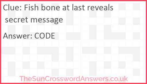 Fish bone at last reveals secret message is a crossword clue for which we have 1 possible answer and we have spotted 4 times in our database. This crossword clue was last seen on 17 May 2024 in The Sun Cryptic Crossword puzzle!