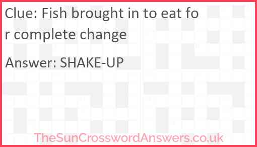 Fish brought in to eat for complete change is a crossword clue for which we have 2 possible answer and we have spotted 4 times in our database. This crossword clue was last seen on 22 July 2025 in The Sun Cryptic Crossword puzzle!