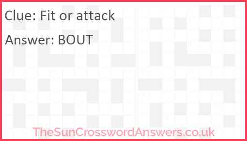 Fit or attack is a crossword clue for which we have 1 possible answer and we have spotted 1 times in our database. This crossword clue was last seen on 15 July 2024 in The Sun Coffee Time Crossword puzzle!