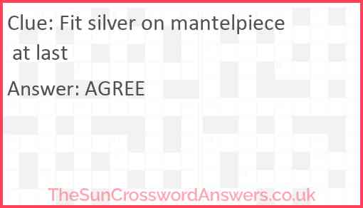 Fit silver on mantelpiece at last is a crossword clue for which we have 1 possible answer and we have spotted 3 times in our database. This crossword clue was last seen on 26 July 2024 in The Sun Cryptic Crossword puzzle!