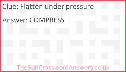 Flatten under pressure is a crossword clue for which we have 1 possible answer and we have spotted 3 times in our database. This crossword clue was last seen on 27 February 2024 in The Sun Coffee Time Crossword puzzle!