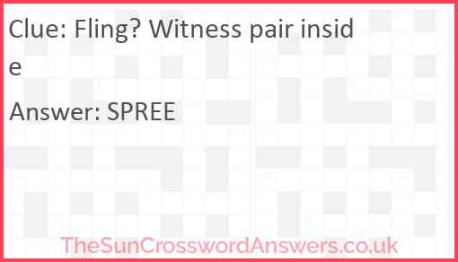 Fling? Witness pair inside is a crossword clue for which we have 1 possible answer and we have spotted 2 times in our database. This crossword clue was last seen on 20 October 2024 in The Sun Cryptic Crossword puzzle!