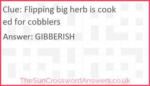 Flipping big herb is cooked for cobblers is a crossword clue for which we have 1 possible answer and we have spotted 2 times in our database. This crossword clue was last seen on 22 January 2023 in The Sun Cryptic Crossword puzzle!
