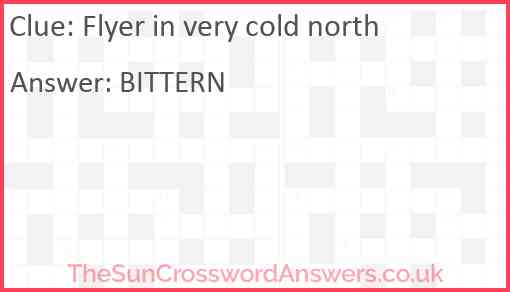 Flyer in very cold north is a crossword clue for which we have 1 possible answer and we have spotted 1 times in our database. This crossword clue was last seen on 10 September 2020 in The Sun Cryptic Crossword puzzle!