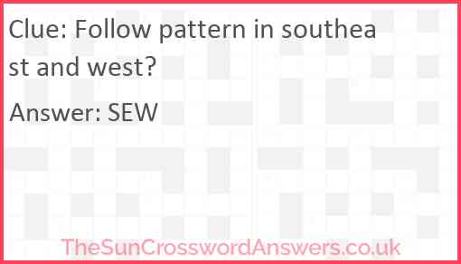 Follow pattern in southeast and west? is a crossword clue for which we have 1 possible answer and we have spotted 1 times in our database. This crossword clue was last seen on 28 March 2021 in The Sun Cryptic Crossword puzzle!