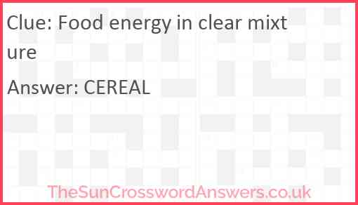 Food energy in clear mixture is a crossword clue for which we have 1 possible answer and we have spotted 3 times in our database. This crossword clue was last seen on 17 June 2025 in The Sun Cryptic Crossword puzzle!