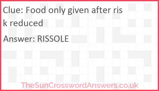 Food only given after risk reduced is a crossword clue for which we have 1 possible answer and we have spotted 1 times in our database. This crossword clue was last seen on 12 January 2024 in The Sun Cryptic Crossword puzzle!
