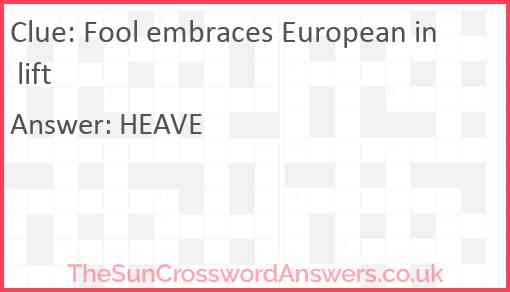 Fool embraces European in lift is a crossword clue for which we have 1 possible answer and we have spotted 3 times in our database. This crossword clue was last seen on 04 November 2024 in The Sun Cryptic Crossword puzzle!