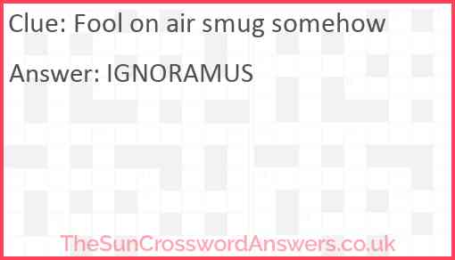 Fool on air smug somehow is a crossword clue for which we have 1 possible answer and we have spotted 1 times in our database. This crossword clue was last seen on 16 March 2025 in The Sun Cryptic Crossword puzzle!