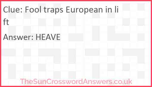 Fool traps European in lift is a crossword clue for which we have 1 possible answer and we have spotted 6 times in our database. This crossword clue was last seen on 24 December 2024 in The Sun Cryptic Crossword puzzle!