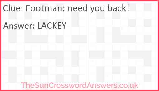 Footman: need you back! is a crossword clue for which we have 1 possible answer and we have spotted 1 times in our database. This crossword clue was last seen on 12 November 2024 in The Sun Cryptic Crossword puzzle!