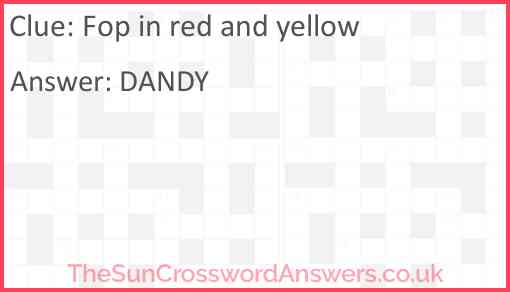 Fop in red and yellow is a crossword clue for which we have 1 possible answer and we have spotted 2 times in our database. This crossword clue was last seen on 14 April 2024 in The Sun Cryptic Crossword puzzle!