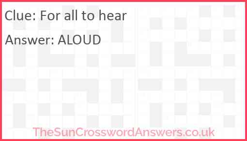 For all to hear is a crossword clue for which we have 1 possible answer and we have spotted 1 times in our database. This crossword clue was last seen on 28 June 2019 in The Sun Coffee Time Crossword puzzle!
