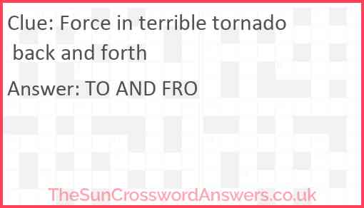 Force in terrible tornado back and forth is a crossword clue for which we have 2 possible answer and we have spotted 2 times in our database. This crossword clue was last seen on 15 September 2021 in The Sun Cryptic Crossword puzzle!