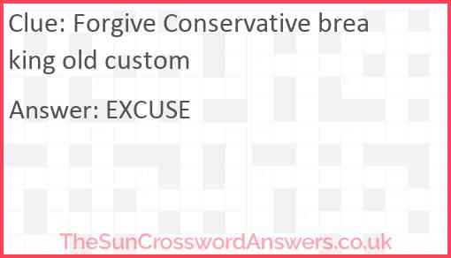 Forgive Conservative breaking old custom is a crossword clue for which we have 1 possible answer and we have spotted 1 times in our database. This crossword clue was last seen on 06 September 2022 in The Sun Cryptic Crossword puzzle!