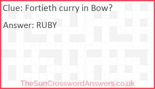 Fortieth curry in Bow? is a crossword clue for which we have 1 possible answer and we have spotted 3 times in our database. This crossword clue was last seen on 15 August 2023 in The Sun Cryptic Crossword puzzle!