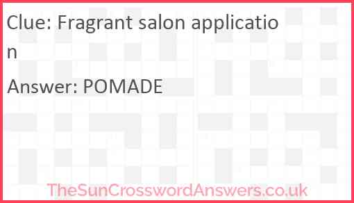 Fragrant salon application is a crossword clue for which we have 1 possible answer and we have spotted 1 times in our database. This crossword clue was last seen on 20 February 2024 in The Sun Coffee Time Crossword puzzle!