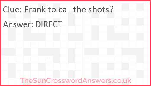 Frank to call the shots is a crossword clue for which we have 1 possible answer and we have spotted 2 times in our database. This crossword clue was last seen on 11 January 2021 in The Sun Cryptic Crossword puzzle!