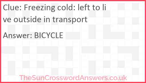 Freezing cold: left to live outside in transport is a crossword clue for which we have 1 possible answer and we have spotted 1 times in our database. This crossword clue was last seen on 03 August 2022 in The Sun Cryptic Crossword puzzle!