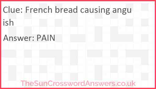 French bread causing anguish is a crossword clue for which we have 1 possible answer and we have spotted 3 times in our database. This crossword clue was last seen on 22 January 2024 in The Sun Cryptic Crossword puzzle!