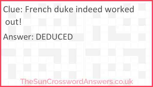 French duke indeed worked out! is a crossword clue for which we have 1 possible answer and we have spotted 3 times in our database. This crossword clue was last seen on 05 May 2024 in The Sun Cryptic Crossword puzzle!