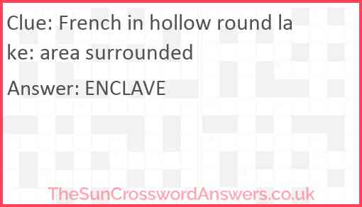 French in hollow round lake: area surrounded is a crossword clue for which we have 1 possible answer and we have spotted 2 times in our database. This crossword clue was last seen on 14 March 2023 in The Sun Cryptic Crossword puzzle!