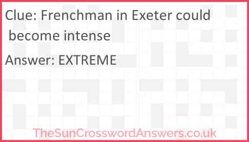 Frenchman in Exeter could become intense is a crossword clue for which we have 1 possible answer and we have spotted 2 times in our database. This crossword clue was last seen on 23 June 2022 in The Sun Cryptic Crossword puzzle!