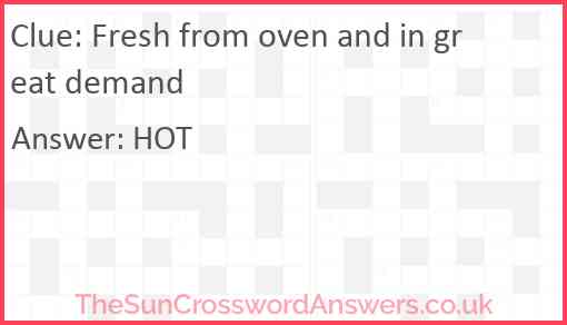 Fresh from oven and in great demand is a crossword clue for which we have 1 possible answer and we have spotted 3 times in our database. This crossword clue was last seen on 14 June 2023 in The Sun Cryptic Crossword puzzle!