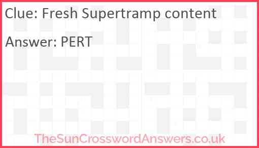 Fresh Supertramp content is a crossword clue for which we have 1 possible answer and we have spotted 2 times in our database. This crossword clue was last seen on 01 July 2024 in The Sun Cryptic Crossword puzzle!