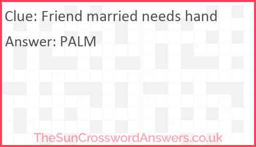 Friend married needs hand is a crossword clue for which we have 1 possible answer and we have spotted 1 times in our database. This crossword clue was last seen on 31 October 2021 in The Sun Cryptic Crossword puzzle!