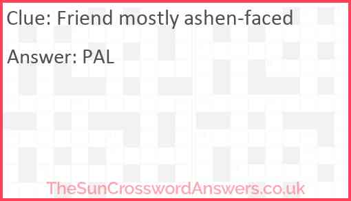 Friend mostly ashen-faced is a crossword clue for which we have 1 possible answer and we have spotted 4 times in our database. This crossword clue was last seen on 04 June 2025 in The Sun Cryptic Crossword puzzle!