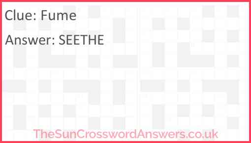 Fume is a crossword clue for which we have 1 possible answer and we have spotted 7 times in our database. This crossword clue was last seen on 16 August 2024 in The Sun Coffee Time Crossword puzzle!