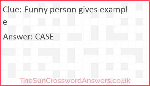 Funny person gives example is a crossword clue for which we have 1 possible answer and we have spotted 2 times in our database. This crossword clue was last seen on 11 August 2024 in The Sun Cryptic Crossword puzzle!