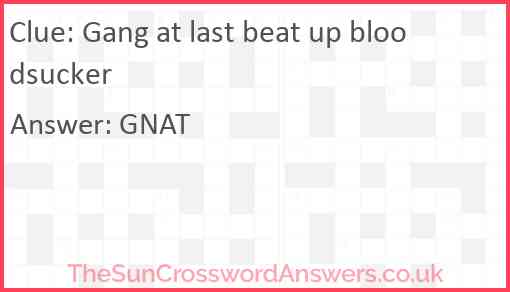 Gang at last beat up bloodsucker is a crossword clue for which we have 1 possible answer and we have spotted 2 times in our database. This crossword clue was last seen on 04 August 2023 in The Sun Cryptic Crossword puzzle!