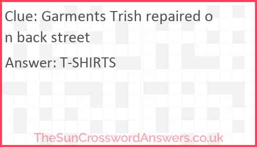 Garments Trish repaired on back street is a crossword clue for which we have 2 possible answer and we have spotted 2 times in our database. This crossword clue was last seen on 26 July 2023 in The Sun Cryptic Crossword puzzle!