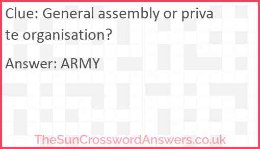 General assembly or private organisation? is a crossword clue for which we have 1 possible answer and we have spotted 2 times in our database. This crossword clue was last seen on 18 June 2023 in The Sun Cryptic Crossword puzzle!