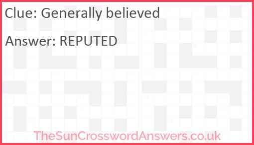 Generally believed is a crossword clue for which we have 1 possible answer and we have spotted 4 times in our database. This crossword clue was last seen on 22 April 2025 in The Sun Coffee Time Crossword puzzle!