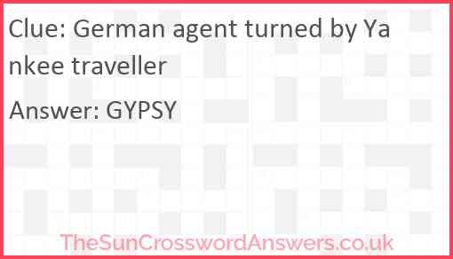 German agent turned by Yankee traveller is a crossword clue for which we have 1 possible answer and we have spotted 2 times in our database. This crossword clue was last seen on 02 June 2024 in The Sun Cryptic Crossword puzzle!